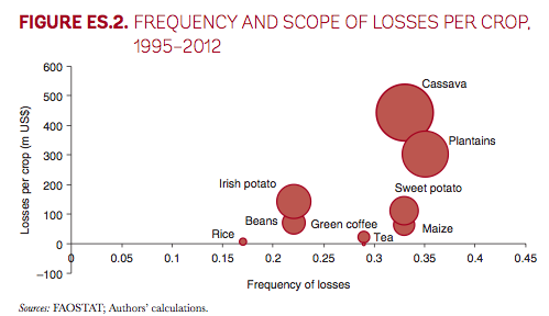 Currently, the crops most exposed to risks are cassava and plantain, followed by fairly evenly distributed losses between Irish potatoes and sweet potatoes. Maize has relatively frequent losses but the losses are not as large as for the first four crops. The scope of the losses are clearly in line with the importance of the crop in the total sector, because cassava, plantain, potatoes, and maize dominate agricultural production in terms of value.